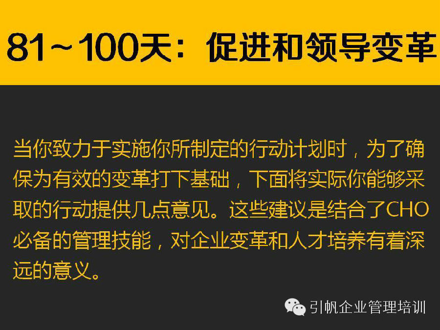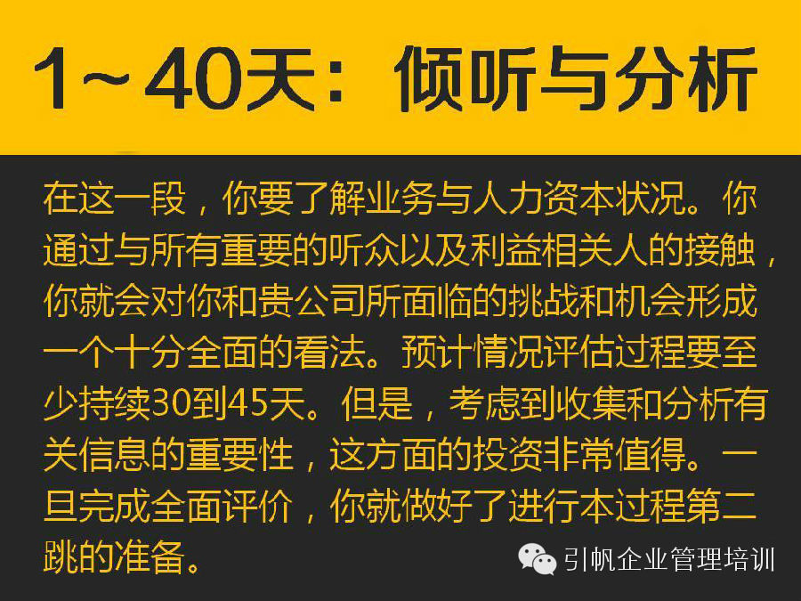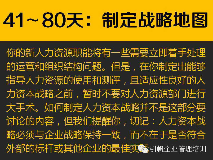 尽管这最初的100天可能有点像是在坐过山车,但是,你在这100天里按此做下去,你就会真正成为企业的业务合作伙伴,你就会成为企业内部关键人才的总管!