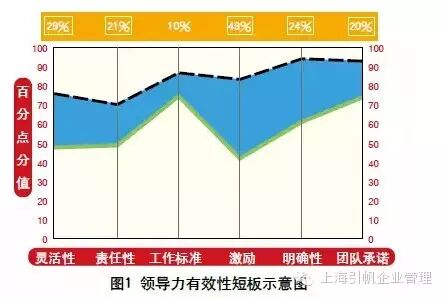 领导力并不仅仅指的是一把手、CEO个人的领导力,而是指整个管理团队的领导力。领导力的评判也是从其绩效出发的。在市场、政策、外部环境没有大变化的情况下,领导人员通过什么样的手段帮助公司去提升绩效呢?一个最直接的提升绩效的动力就是用好他们手中的资源,即团队成员。那么怎么才能够把他们手里的这些资源用好,从而最大化提升他们团队的绩效和组织的绩效呢,我们研究发现第一个最直接的影响因素是“组织气氛”,其对业务绩效的影响可以达到30%。组织或者团队中一把手的领导风格会在70%的程度上影响到这个团队的气氛。一个领导人用什么样的方式去管理和带队伍,跟他个人的特点有关系,也跟岗位本身的要求和所处的环境有关。通过一些数据,可以发现领导力有效性的短板(如图1)。